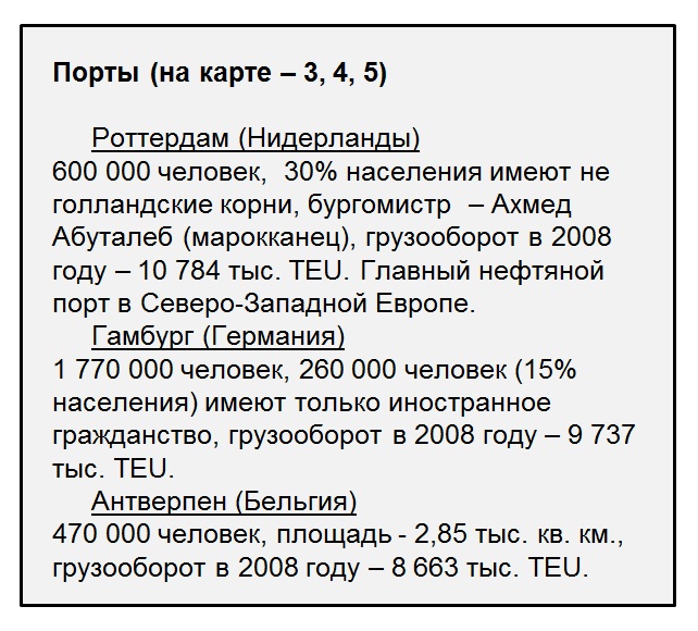 Эти районы занимают относительно небольшую площадь, компактны и удобны с точки зрения управления стоимостью. Оба района – красивые офисные здания, выставки и конференции, университеты, театры и музеи – это парадная витрина Европы и фактически сбывшаяся мечта иммигранта о красивой жизни, и они подтверждают свой особый интерес к этим местам, время от времени устраивая погромы в пригородах Парижа. Среди 50 крупнейших по грузообороту портов мира в 2008 году было 9 европейских, которые приняли около 50 000 тыс. TEU грузов. Из них Роттердам и Гамбург вместе обеспечивают 40% этого грузооборота. При этом глубоководный Роттердам, имеющий стратегическое значение для Европы, европейским фактически уже не является.