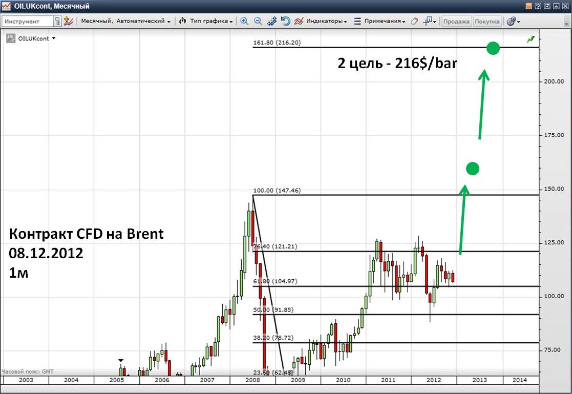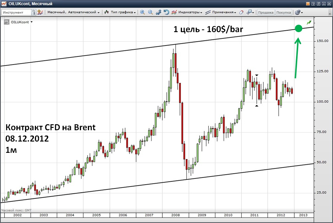На десятилетних временных интервалах Brent торгуется в канале, границы которого проходят через минимумы 2001 г. и 2008 г. и максимум 2008 г. Следующий максимум в пределах этого канала находится на уровне 160$, это первый целевой уровень.
