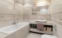 - Крупноформатная плитка оставляет значительно меньше визуальных швов. Правильно подобранная, она будет уместно смотреться в любой ванной комнате.